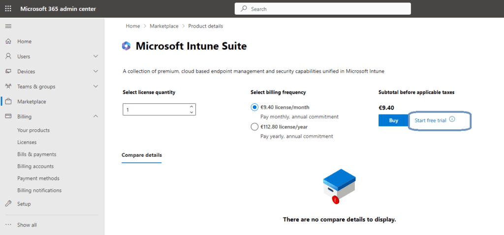 For this demo I added some trial licenses. Here are the steps you can take if you want to follow along. Make sure that your account is a global admin or billing administrator. Login to the Microsoft 365 admin center and go to Marketplace. Use the seach box to search for something like Intune Suite. You might need to scroll down a bit until you see Microsoft Intune Suite.