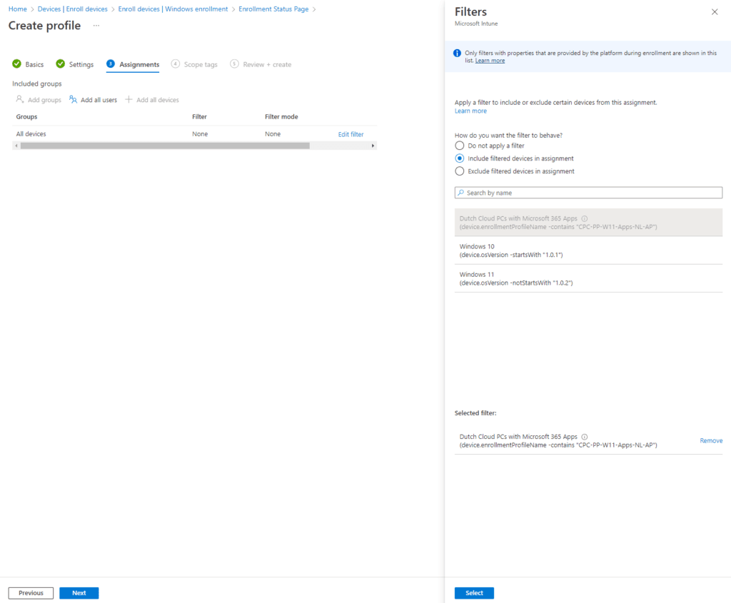 In my case, the name is CPC-PP-W11-Apps-NL-AP. Go to Devices, Other, Filters or Tenant Admin, Filters. Create a new filter and;