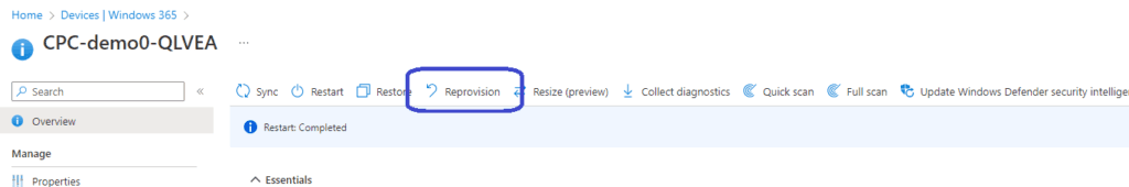 Now it’s time to reprovision the Cloud PC. Go to Devices, Provisioning, Windows 365, All Cloud PCs. Click on the Cloud PC and click on Reprovision.