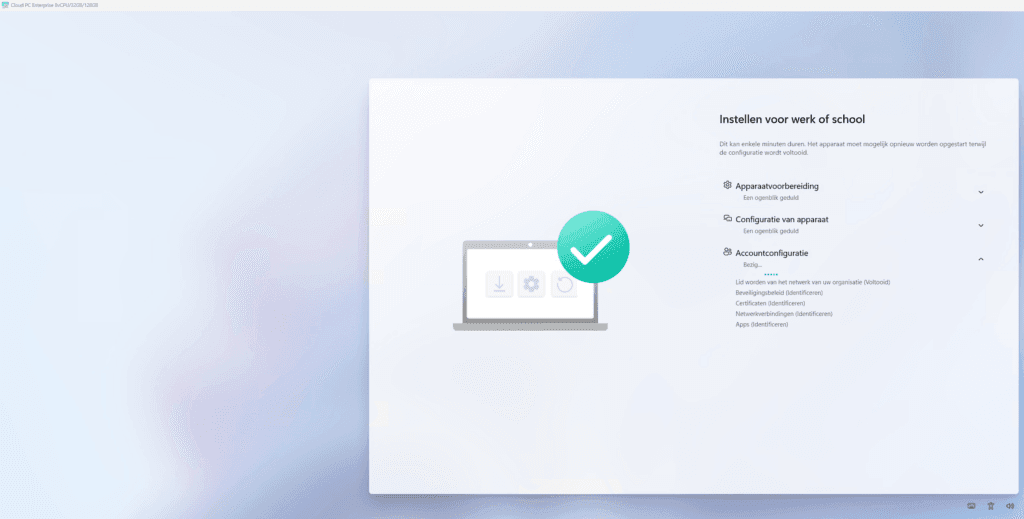 Check the menu bar on the top left side to verify that this ESP is presented on a Cloud PC. In my demo environment I only have a couple of apps and profiles assigned to my demo user so this process was pretty fast.