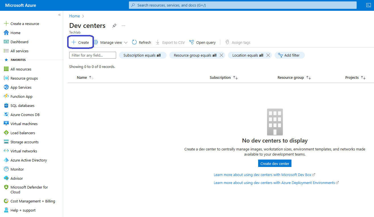 Sign into the Azure portal and search for ‘Dev Centers‘. Click on the + Add button in the ribbon to create your first DevCenter.