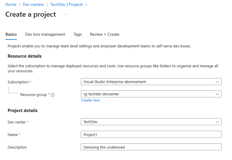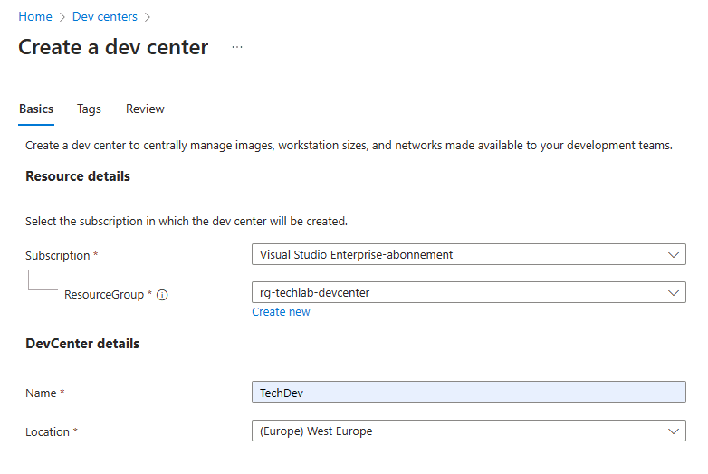 Select the correct Azure subscription and resource group. Give the DevCenter a name and select the location.