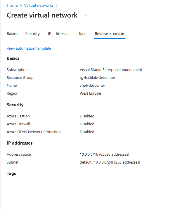 You can add some tags if you want to and continue to the Review + Create step. Create the project if you are happy with the settings.