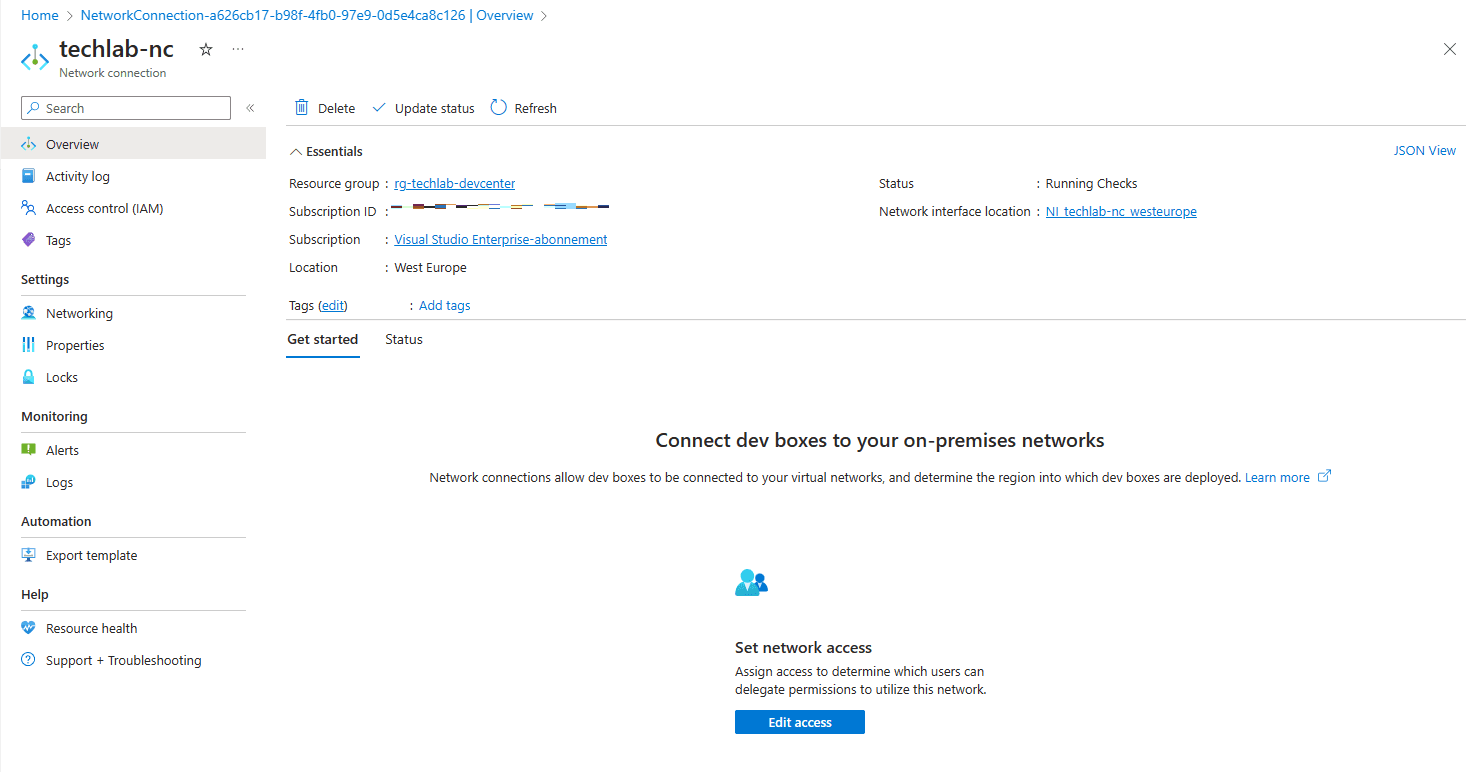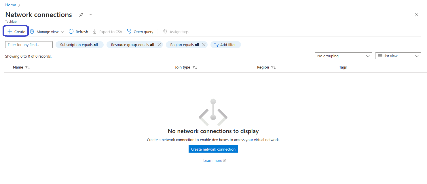We can’t use the virtual network in our DevCenter yet. First we need to configure it as a network connection. To do so, search for Network connections in the Azure portal. Click the + Create button in the ribbon.