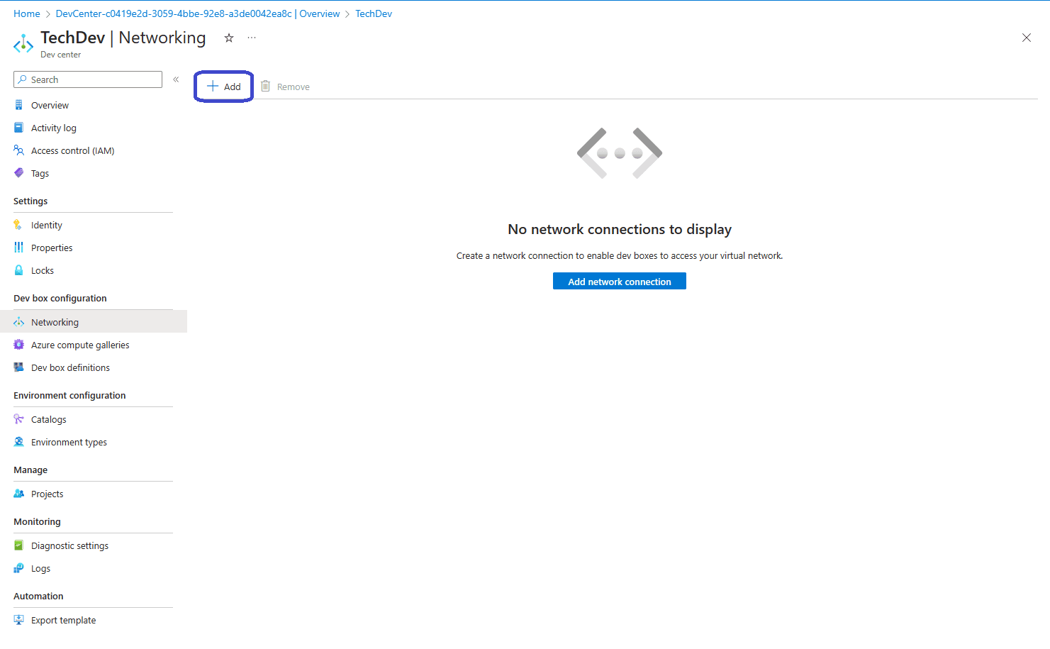 Now it’s time to link the network connection to the DevCenter. From the Azure portal, Dev Centers. Click the DevCenter your created earlier. Dev Box Configuration, Networking.