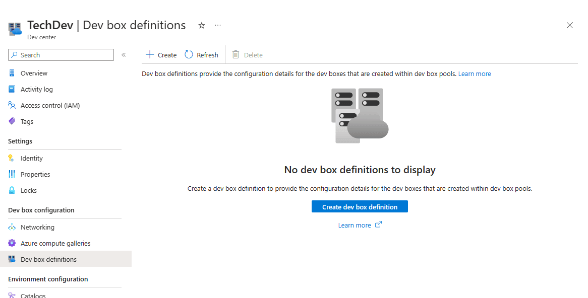The next step is to define the hardware specs that our developers can use. We can define these definitions in the Dev box configuration, Dev box definitions menu.