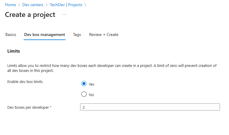 Moving on to the Dev box management tab. With limits you can set a limit to the number of dev boxes that each developer can create. If you leave the default option (No) then your devs can create as many dev boxes as they want. If you set the number to 0, then your devs cannot add dev boxes to this project.