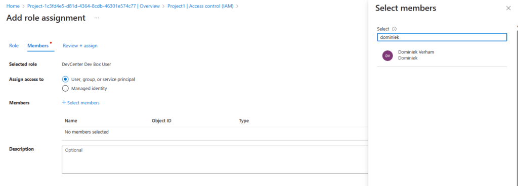 Click the + Add button in the ribbon and select Add role assignmentSelect the DevCenter Dev Box User role and click Next. Search for a group or select individual users. For this demo I’ll just select one user.