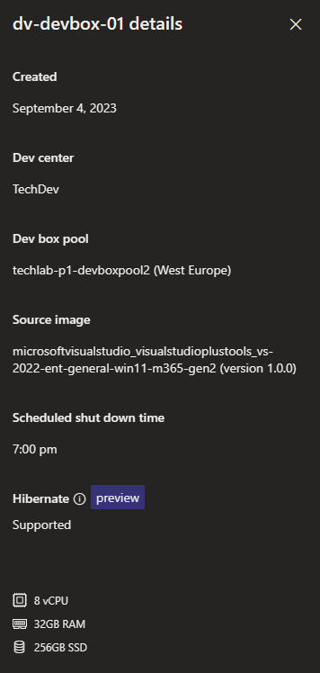 Now that I’ve signed in as a developer, I can add my own VMs according to the settings of the project. I just have to click the + New dev box button. A pane will appear from the righthand side of the screen: