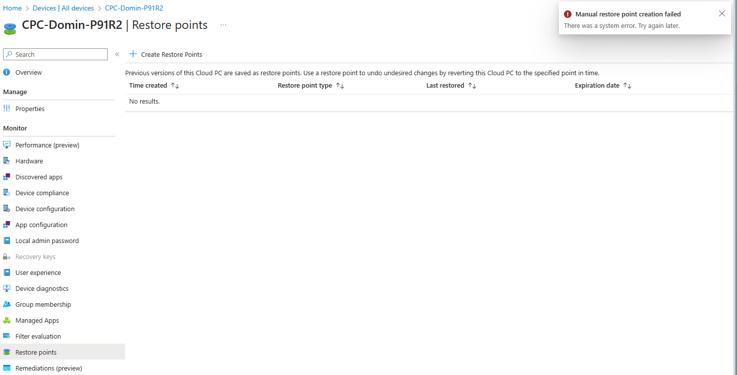 Back to the point in time restore feature. You can go to the restore points menu item and you’ll see that they do not have restore points. You cannot manually create a restore point. Microsoft Intune will give you a friendly reminder;