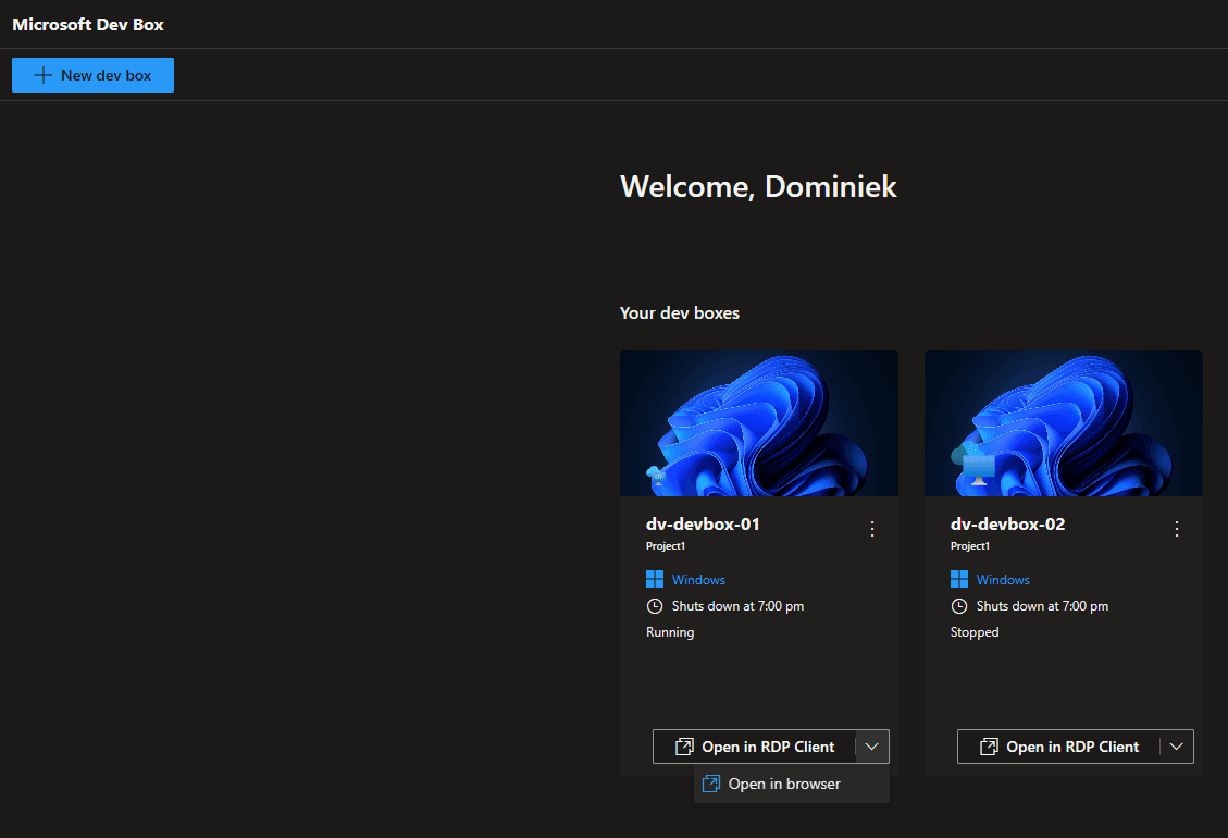 We already saw the dev boxes pop up on the dev box portal. You have all the management options available and you can choose to connect using the browser or the RDP client.