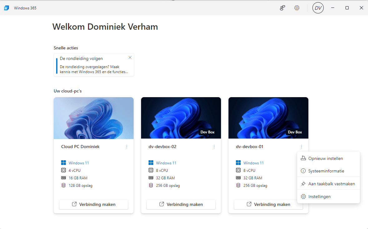 A second way to connect is the Windows 365 portal. You should know that the management options are different for the dev box compared to the dev box portal. Currently you have the following options: