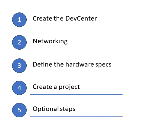 Let’s start with the architecture of dev box. It shows how the different parts of the product fit together. You start by creating a DevCenter and add a project. Next you’ll specify your environment and add your dev box pools. Per pool you assign a definition and network connection. DevCenter can have one or more projects. You can have more DevCenters.