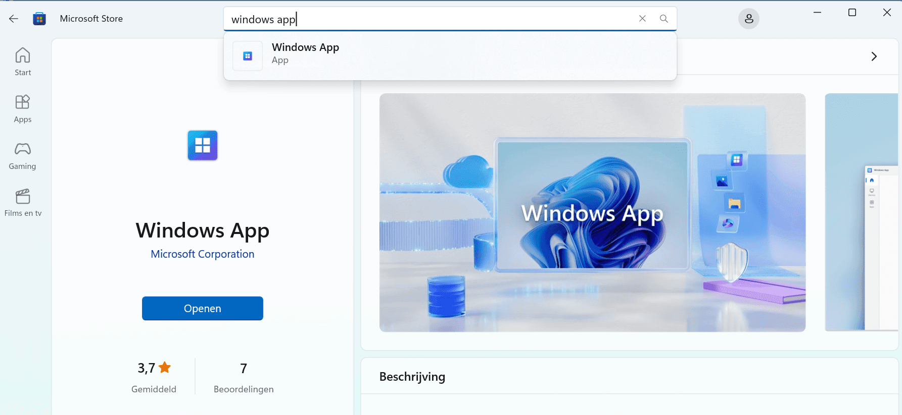 In this demo I will install the app on a Windows 11 system. Open the Microsoft Store and search for Windows app. Another way to get the app is by searching the Microsoft Store on the web.