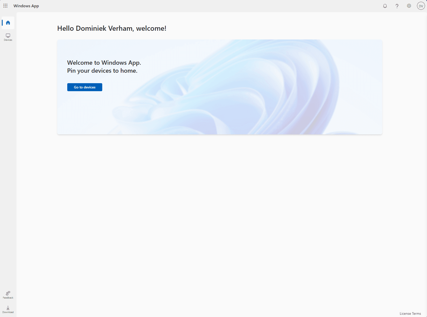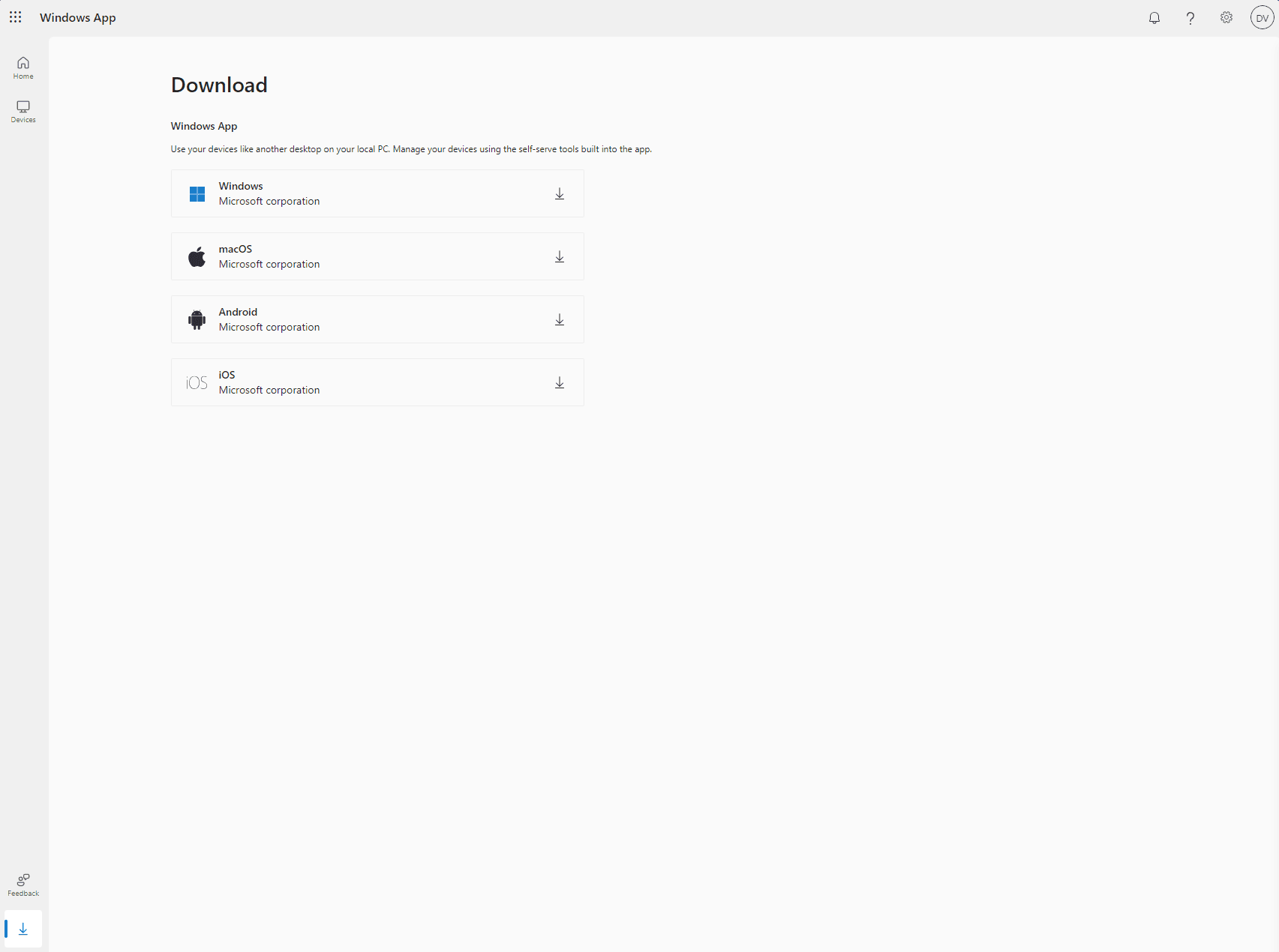 The second icon in the bar on the left will bring you to the devices screen. This will show you the assigned devices from Windows 365, Azure Virtual Desktop and Dev Box. You can’t connect to RDS or Remote PC, those are available (but not supported) from macOS or iPad/iPadOS.