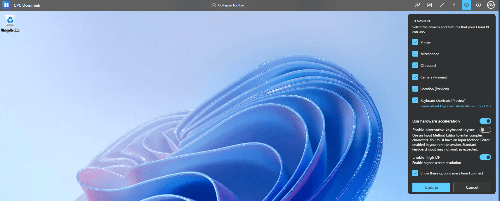 Once connected to the Cloud PC you can make use of all the device redirections and enable High DPI for a better user experience, just like you would using the Windows 365 webclient: