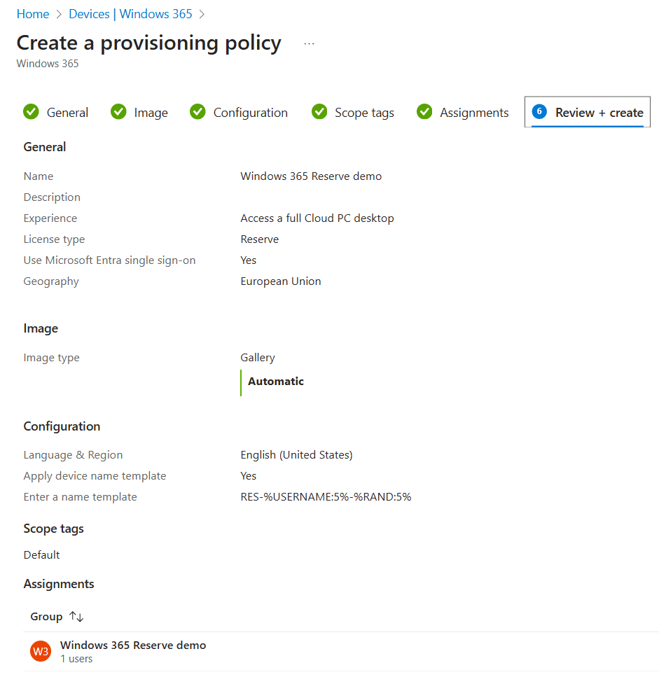 We have now successfully created the provisioning policy. But that does not automatically provision the Reserve Cloud PC.