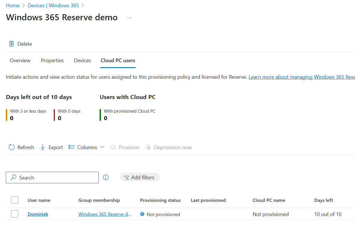 Provisioning a Windows 365 Reserve Cloud PC is a manual action. To do so, you need to go back into the Windows 365 provisioning policy. You will get a couple of tabs with information: