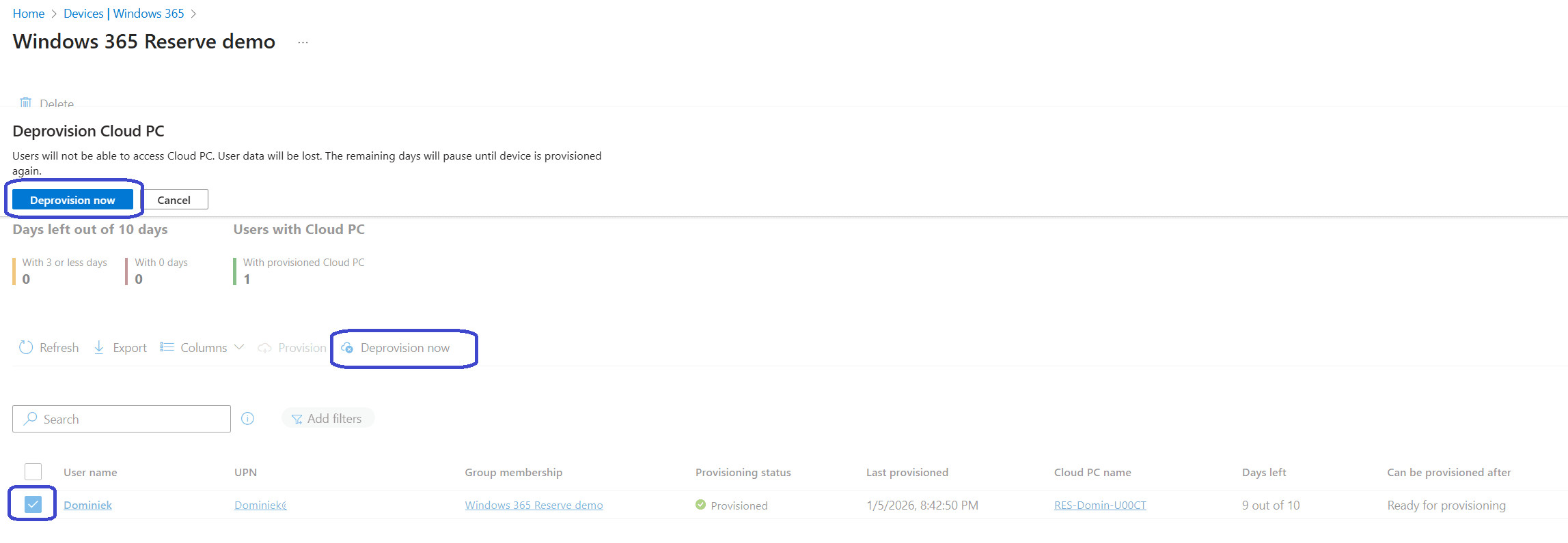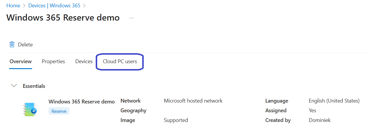 - The Cloud PC users tab is used to manually provision and deprovision Reserve Cloud PCs.