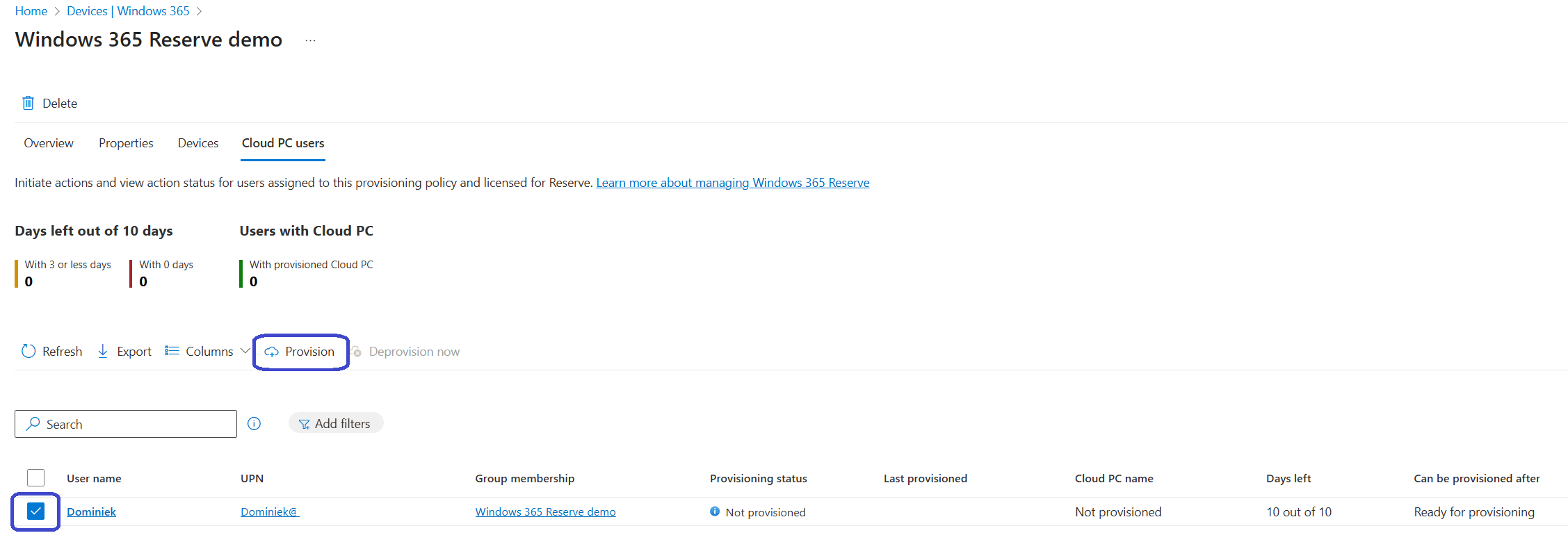 Provisioning a Reserve Cloud PC is on a per user basis, so select the user and click the provision button.