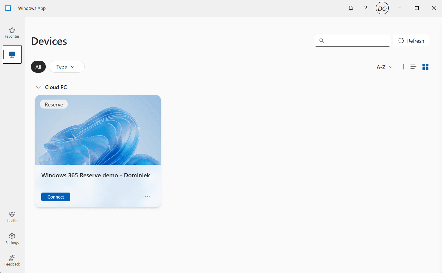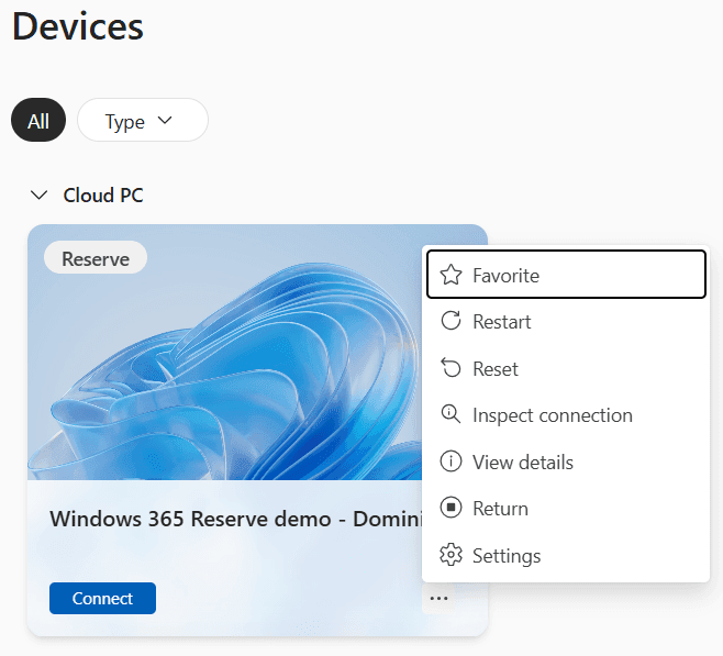 The Windows app is the go to way to connect to your Cloud PCs and that is no different for Windows 365 Reserve Cloud PCs. When users sign into their account, they can see the Cloud PC with the Reserve tag displayed on the card: