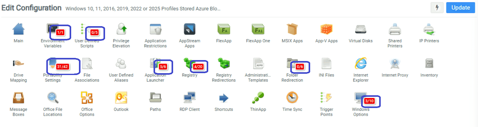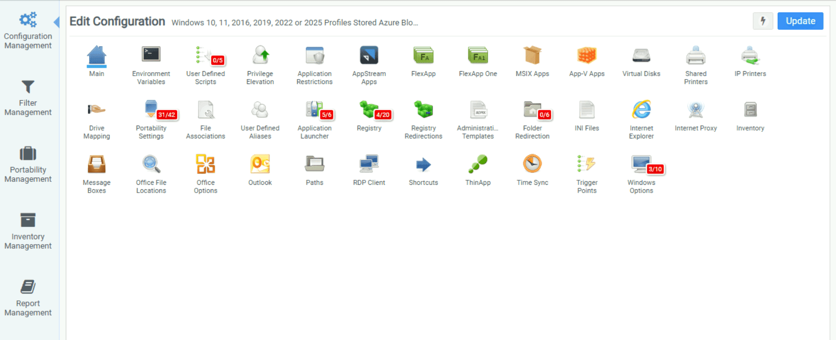 Do not forget about the blue Update button! In fact make sure to click that button each time you changed something. This will effectively update the configuration in the database and deploy an updated .ini file on your file server or cloud storage to be used by the ProfileUnity client on the desktop to retrieve the new settings.