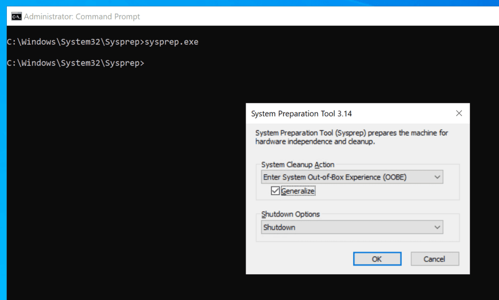 Check the Generalize box to remove any user profiles and select Shutdown in the shutdown options dropdown list and hit the OK button.