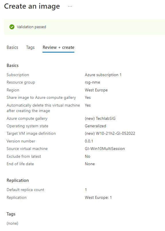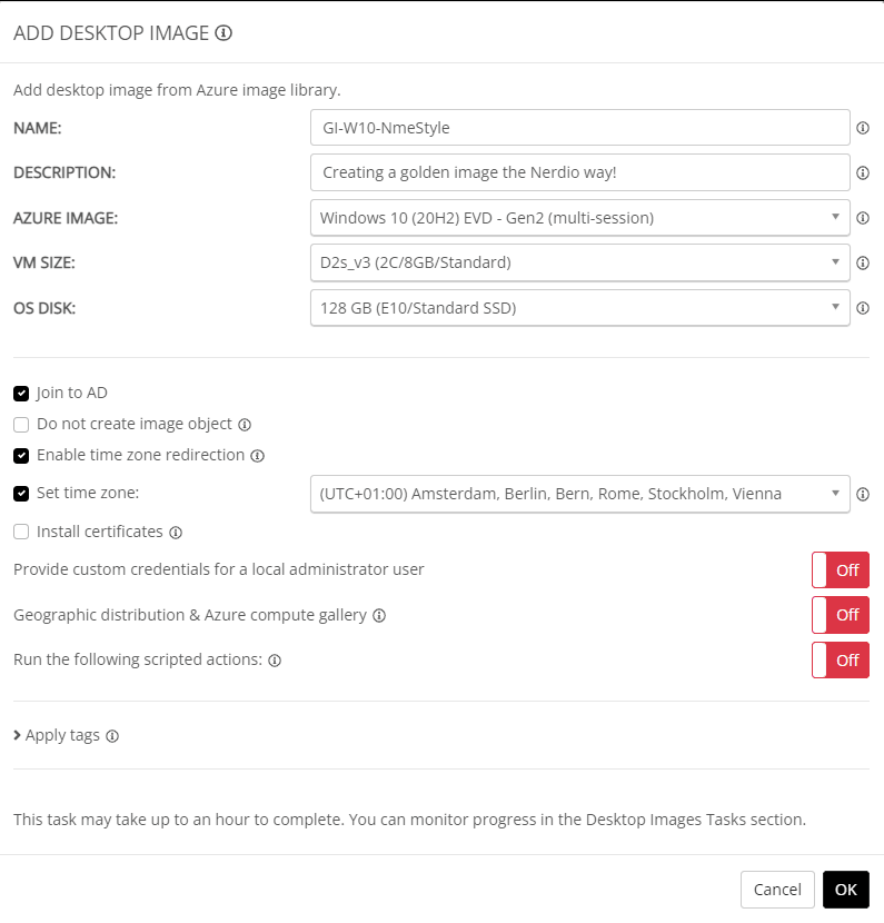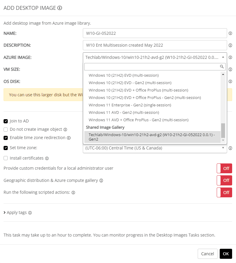 Choose a name for the image, select your Azure image, the VM size and OS disk. I chose to join the VM to Azure AD and I configured the timezone.