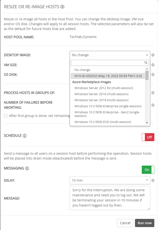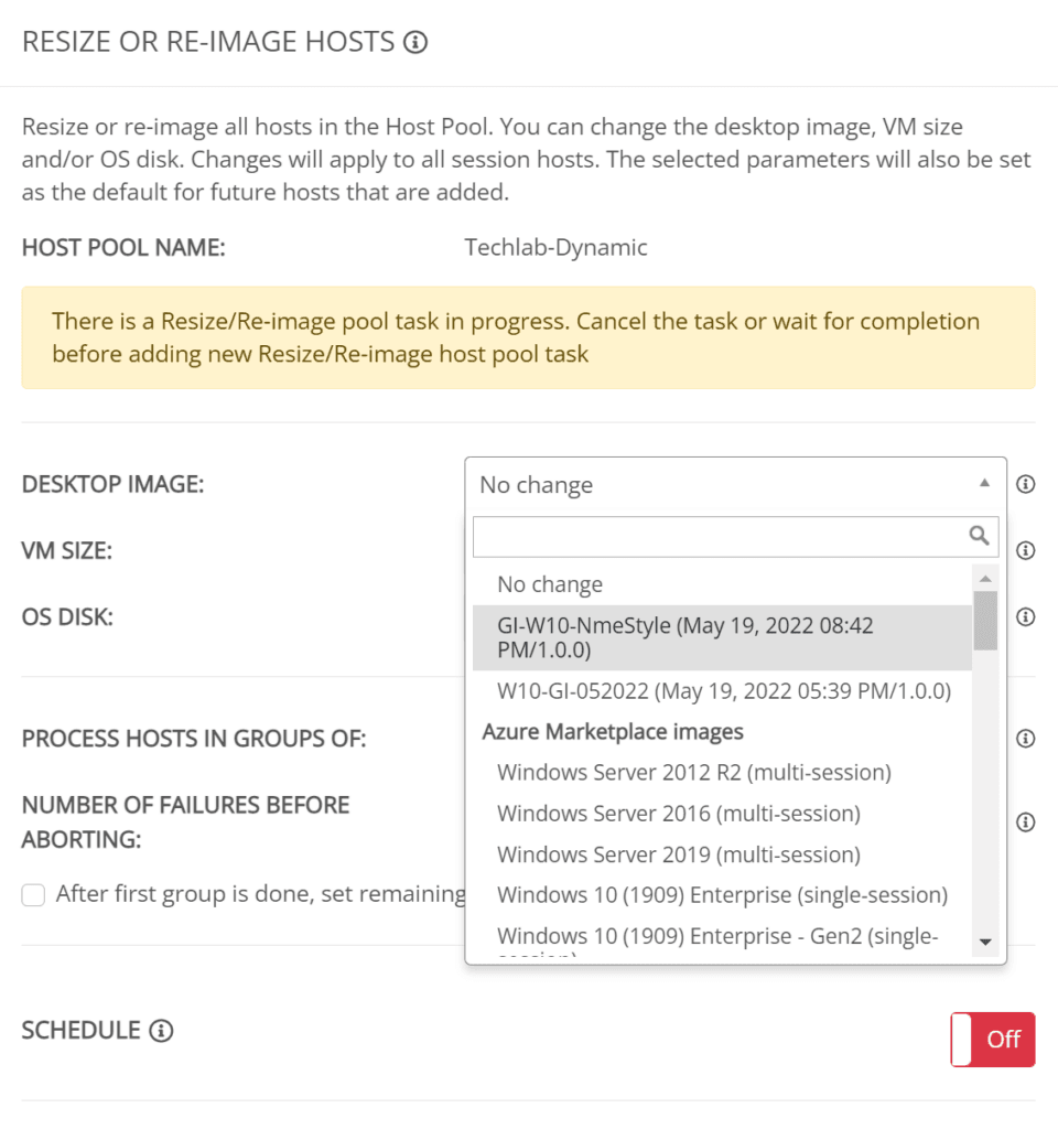 Go back to Workspaces and select Hosts -> Resize/Re-image to re-image the session hosts.