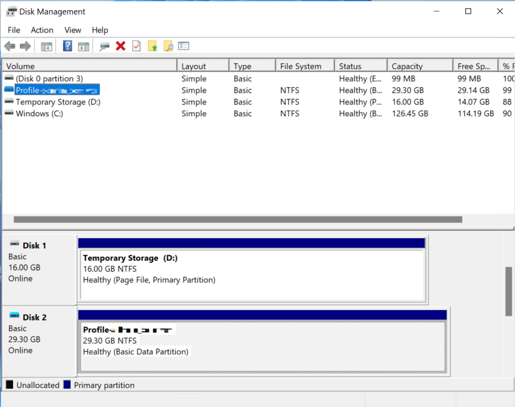 Now is a good time to check if our profile is saved by FSLogix. A good way to check FSLogix is by checking Disk Management and check if there’s a profile disk connected.