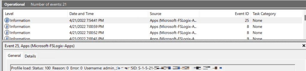 We can also check the Windows Eventlog to check if FSLogix is working. Open the Eventviewer and go to Applications and Services Logs, Microsoft, FSLogix, Apps, Operational. We should see log entries when a user logs on or off.