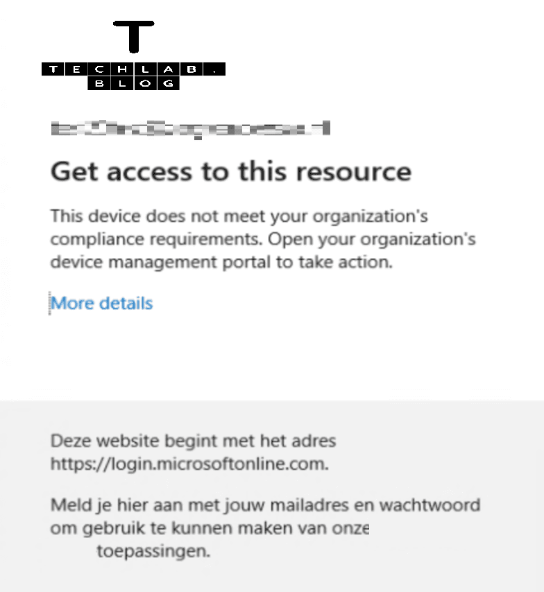 Here is a real world example where users got the message ‘Get access to this resource’ when the Microsoft Teams desktop app starts. The message also tells us a bit more  ‘This device does not meet your organization’s compliance requirements’.
