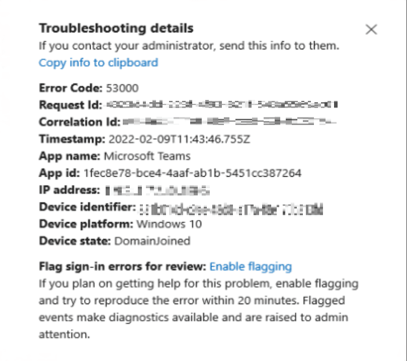 At this point all we know is that a conditional access policy blocks us from accessing the Microsoft Teams desktop app. Users who receive this message have to option to click on a More details option.