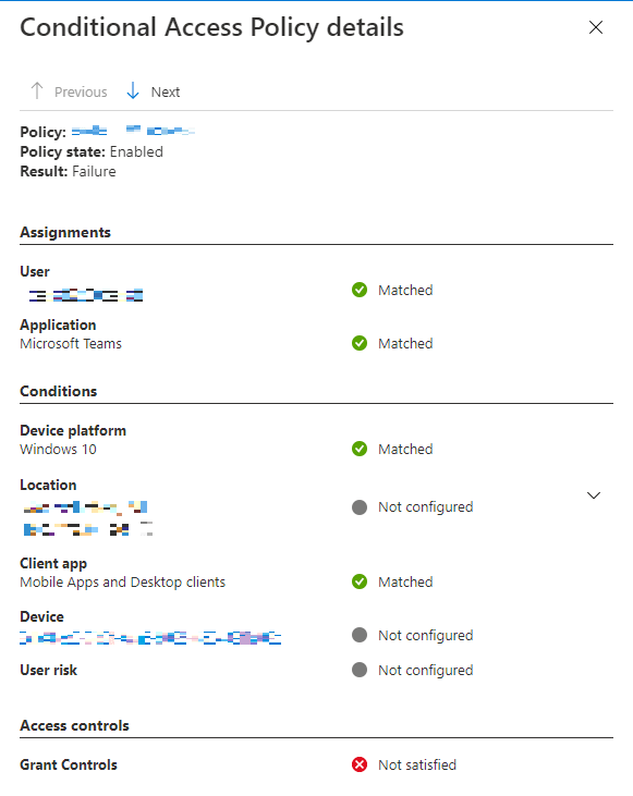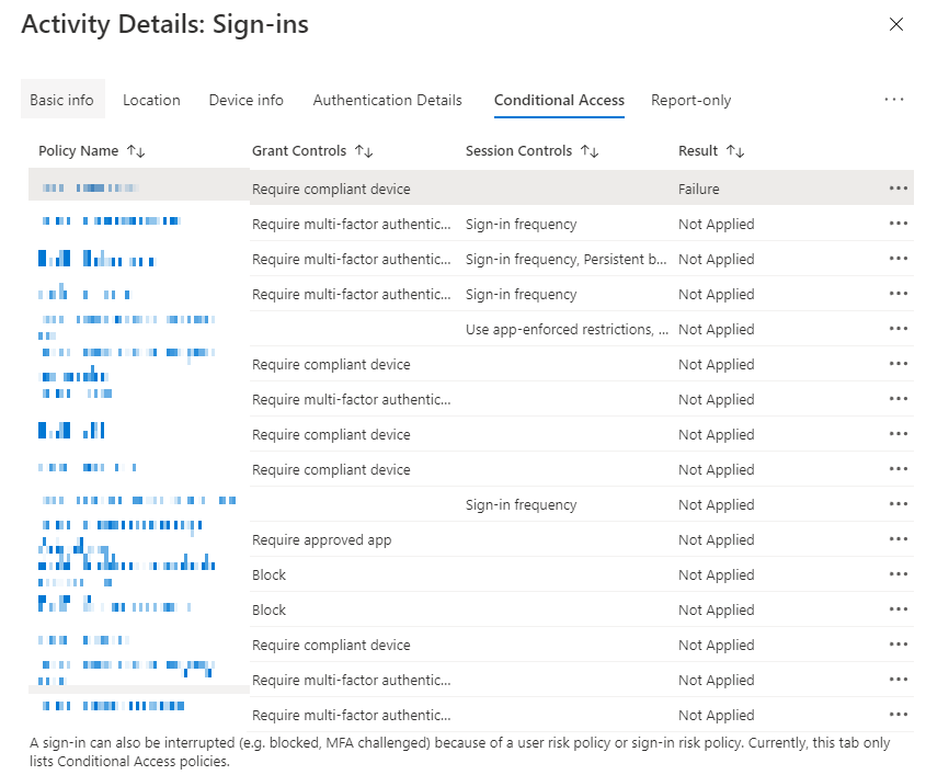 • Conditional Access: This tab shows all of the Conditional Access policies and if they were applied during this sign-in event. It also shows detailed information per policy.