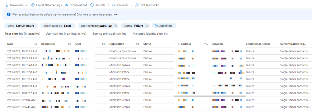 We can set filters on top of the screen. There are many attributes we can use to filter the sign-in events.