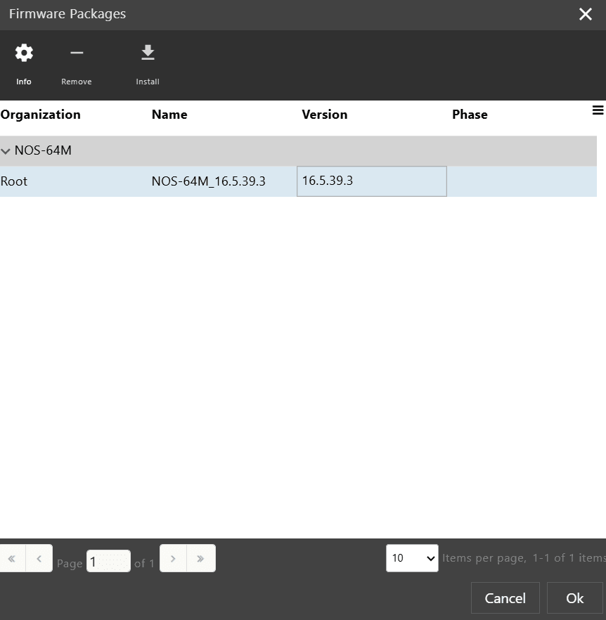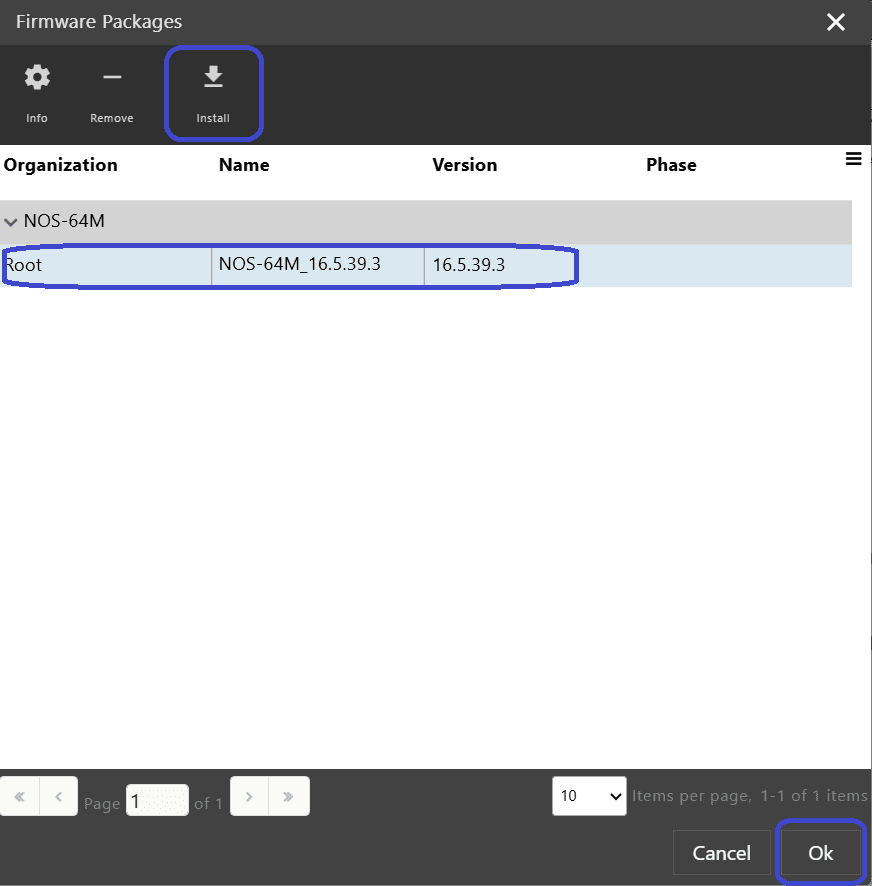 You will see the firmware in the overview once the upload completes. Now select that firmware and notice that the OK button in the lower right corner becomes available. Click OK.