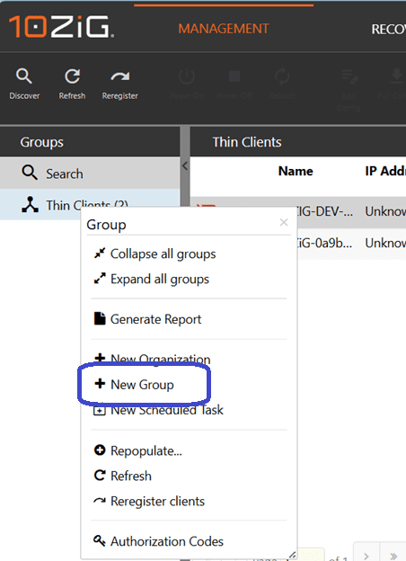 You can make your life even more easy by creating a group in the 10ZiG Manager and apply client configuration settings to automatically update the firmware for new devices. Rightclick in the group window and select + New group.