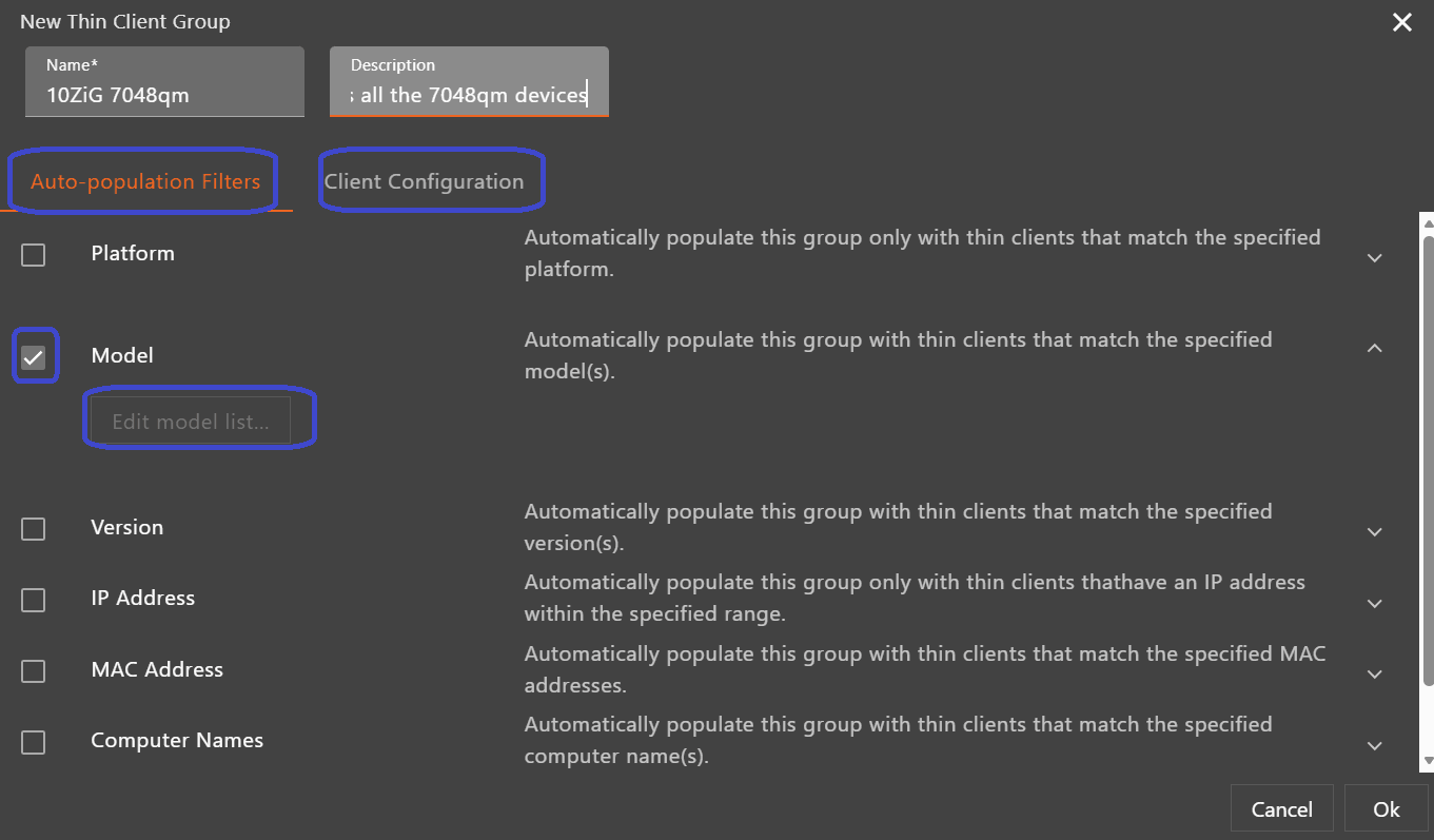 • Auto-population filters are used to group devices based on properties, like the model. Just check the box and enter the model.