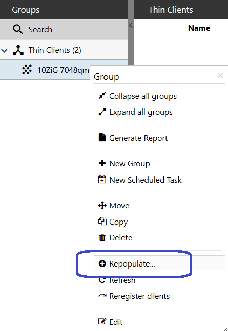 If you can’t see the devices after the Repopulate action, then I would advise to doublecheck the group settings (rightclick and select edit).