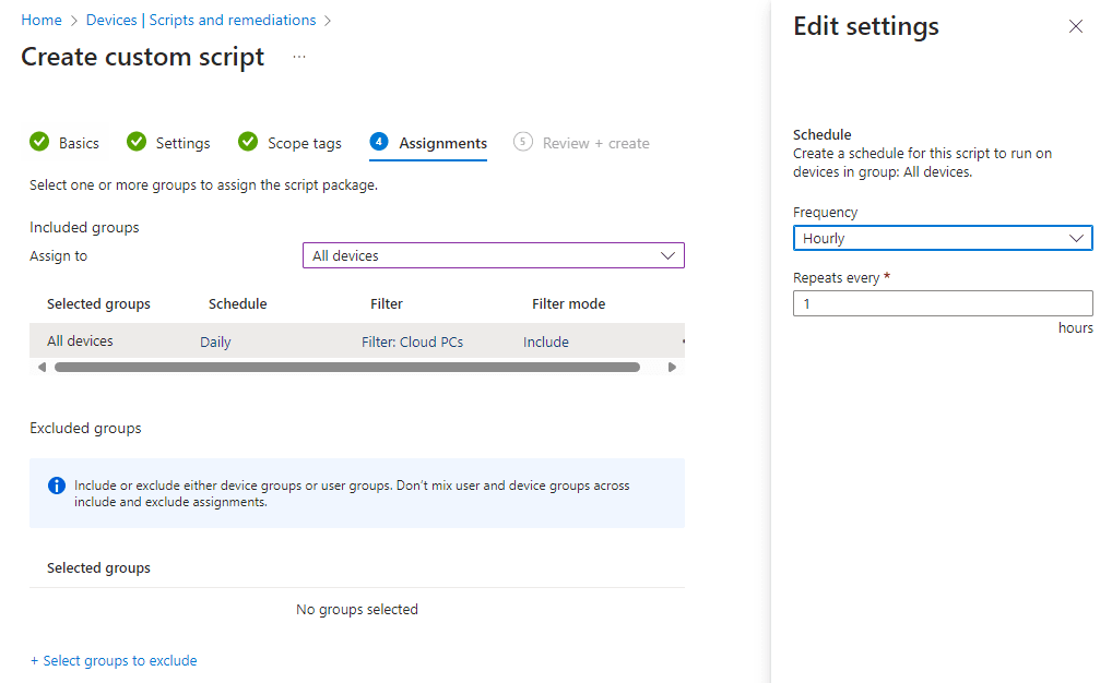 As an admin you can assign this remediation to All users, All devices or a custom group. You can decide to run the script only once of create an hourly or daily schedule.