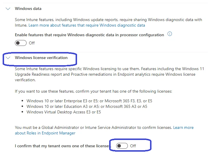 Make sure to check if you have the correct licenses. Microsoft will make sure that you verify before you can use remediations. Assuming that your licenses are good, go to the Microsoft Intune admin center, Tenant administration and toggle the I confirm that my tenant owns one of these licenses switch to On.