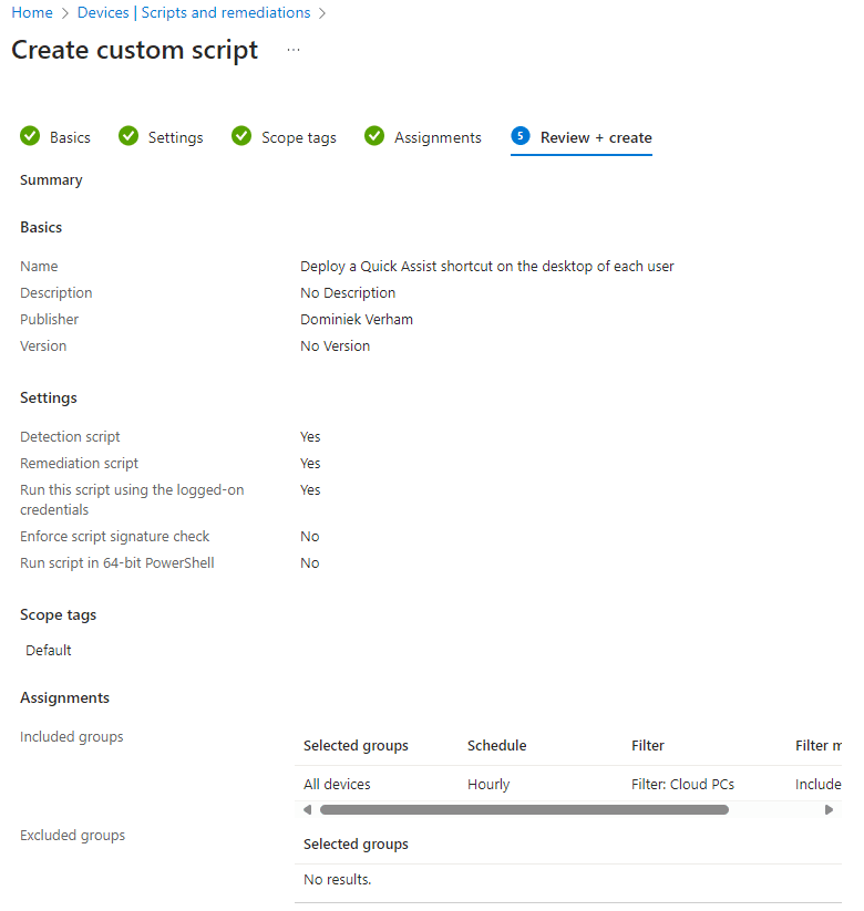 From the assignments tab, assign the remediation to all users, all devices or a custom group. In this demo I chose all devices and used a filter for my Cloud PCs.